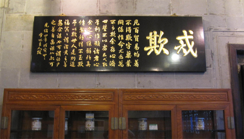 清光緒四年,胡雪巖曾親筆跋文“戒欺”一匾。該匾高懸于胡慶余堂的廳堂,被奉為店訓。“戒欺”匾曰:“凡百貿易均著不得欺字,藥業關系性命尤為萬不可欺。余存心濟世,誓不以劣品弋取厚利,惟愿諸君心余之心。采辦務真,修制務精,不至欺予以欺世人……”這些都是胡雪巖留給后人的最有價值的營商文化遺產。